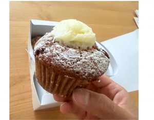 世田谷のメルシーベイクみたいな、クリームチーズフロスティングが上にチョン!と乗っているタイプ。輸送中にやや崩れましたが味は確かです。とてもしっとりしたカロリーを感じる生地に、スパイスの香りがとても良いです。口溶けの良いマフィンですがとてもコッテリ食べ応えあり。美味しい。